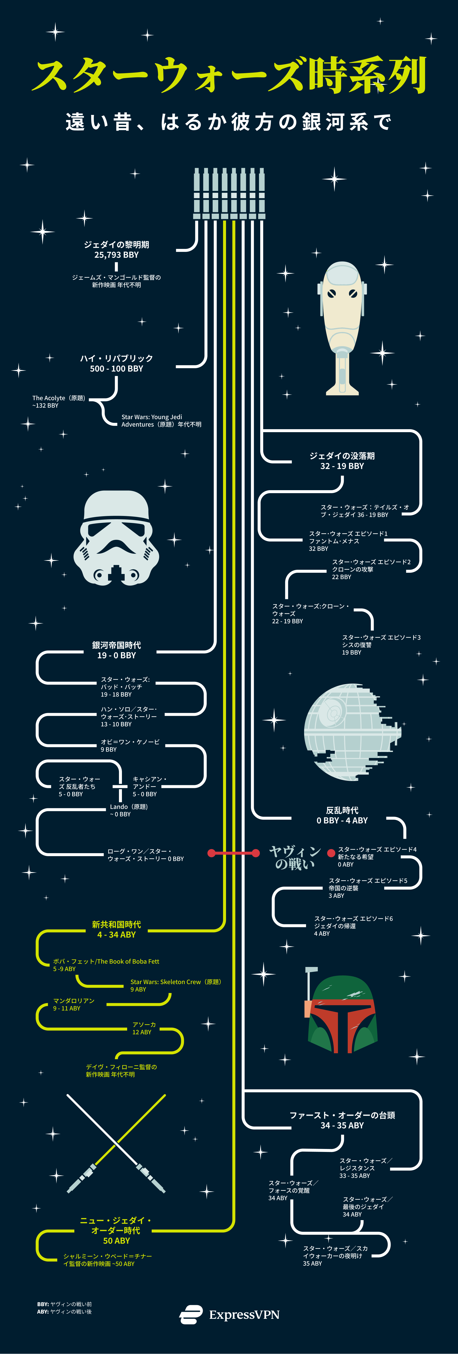 今回ExpressVPNは、スター・ウォーズ世界のすべての映画とシリーズを時系列にまとめました。『ヤヴィンの戦い』(デス・スターとも呼ばれる)は、スター・ウォーズの時間軸において、人間の紀元前と紀元前の転換にも似た極めて重要な瞬間です。そのため、銀河標準暦ではBBY(ヤヴィンの戦い以前)とABY(ヤヴィンの戦い以後)が使われています。