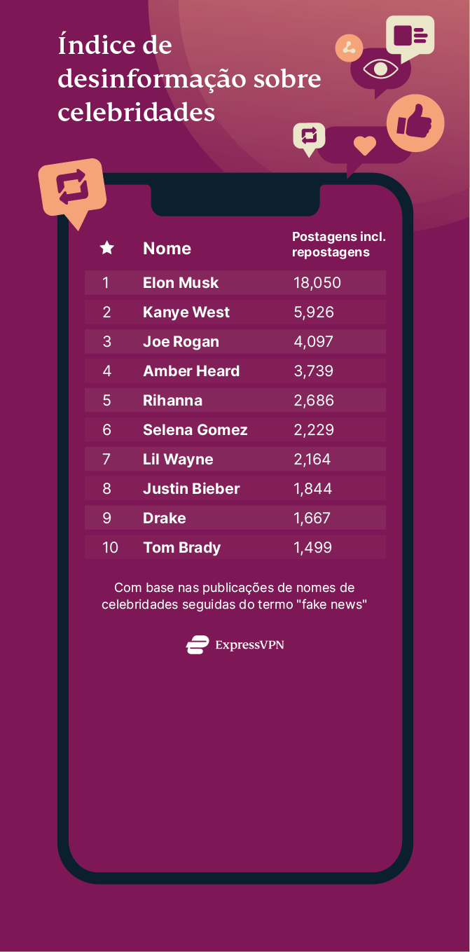 Com celebridades como Beyoncé, Johnny Depp e Kim Kardashian completando o top 15, fica claro que as divas, seus namoros e dólares são os principais impulsionadores das fake news. Vamos dar uma olhada nas estrelas das fake news que tiveram o maior alcance.